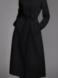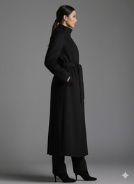 A black wool-blend maxi coat with a stand collar and belt. It provides warmth and a sleek, timeless silhouette.