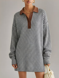 Women’s Black-White Elegant Gingham Collared Half-Button Mini Sweater Dress
