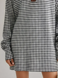A black-and-white gingham mini dress with a collared neckline and half-button placket. It’s cute, cozy, and great for casual days with a chic vibe.