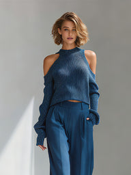 Women's Blue Elegant Ribbed Knit Cold - Shoulder Sweater And Wide - Le