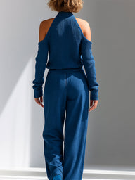 Women's Blue Elegant Ribbed Knit Cold - Shoulder Sweater And Wide - Leg Pants Set MDA1591I8I
