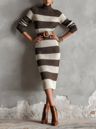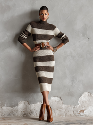 A brown and white striped ribbed knit dress with a turtleneck and belt. It is warm, stylish, and perfect for fall and winter days.
