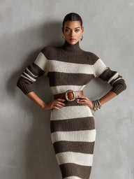 Women’s Brown-White Elegant Ribbed Knit Turtleneck Striped Belted Midi Sweater Dress