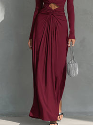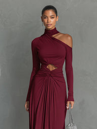 A burgundy jersey maxi dress with an asymmetric one-shoulder cutout and ruched detailing. It’s bold, flattering, and ideal for formal events or chic evening wear.