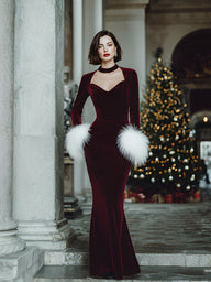 Women’s Burgundy Glamorous Velvet Cutout Choker - Neck Feather - Cuffed Mermaid Gown