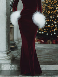 Women's Burgundy Glamorous Velvet Cutout Choker - Neck Feather - Cuffed Mermaid Gown MDA1593J6I