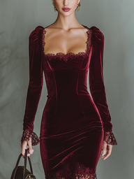 A burgundy velvet maxi dress with delicate lace detailing for a luxurious, figure-skimming silhouette.
