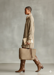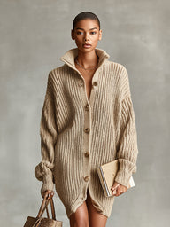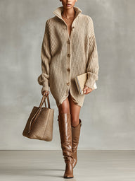 A camel oversized cardigan dress with a button-front detail. It combines coziness with a chic mini silhouette for casual days and stylish evenings.