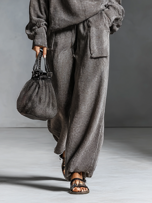 A comfortable and trendy two-piece set featuring a soft corduroy hooded sweatshirt and matching straight pants. Perfect for effortless casual style and cozy all-day wear.
