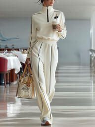 Women's Casual Ribbed Black Trim Zipper Half Turtleneck Sports Set