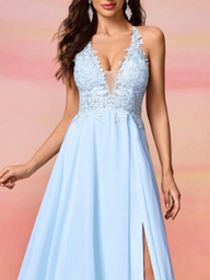 Silhouette: Fitted bodice with a cinched waist flowing into a full-length chiffon skirt with a thigh-high slit for graceful movement and allure.