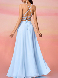 Product Name: Women’s Chiffon Lace Halter Backless Waisted Hem Slit Maxi Dress