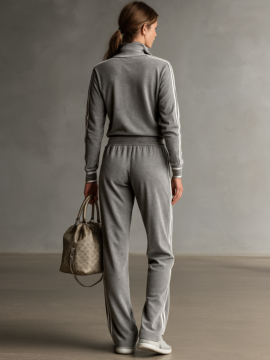 Women's Cotton Blend Embroidered White Trim Zipper Stand Collar Sweatshirt And Sweatpants Set