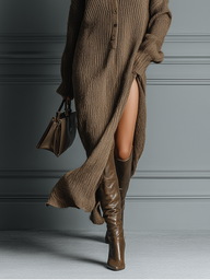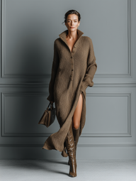 A chunky knitted maxi dress in dark brown with a high slit and stand collar for a dramatic, cozy look.