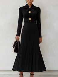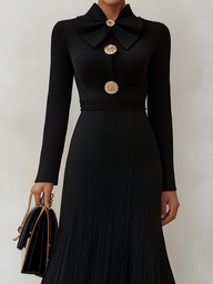 A classic black knitted dress with elegant gold buttons and a bowknot neckline. It features a fitted waist and a long pleated skirt, suitable for formal occasions.