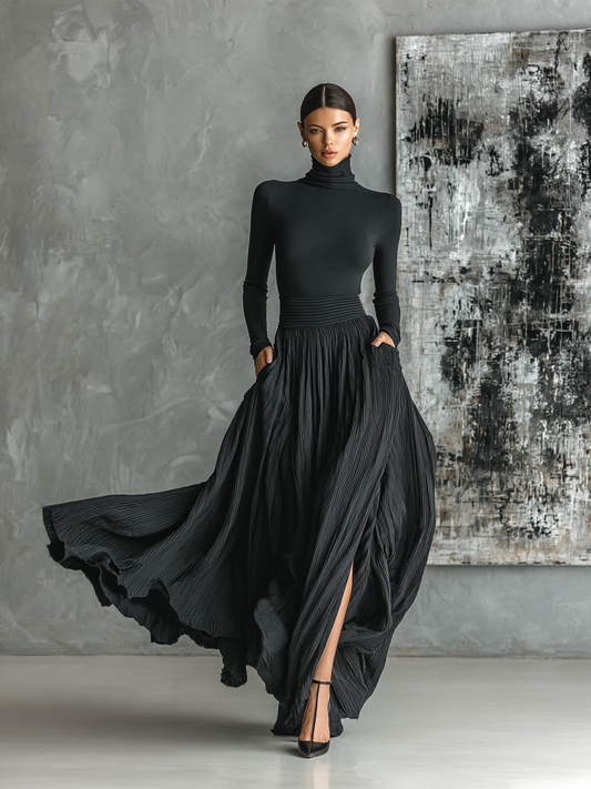 Women's Fashion All Black Skinny Turtleneck T-shirt Pleated Skirt Set