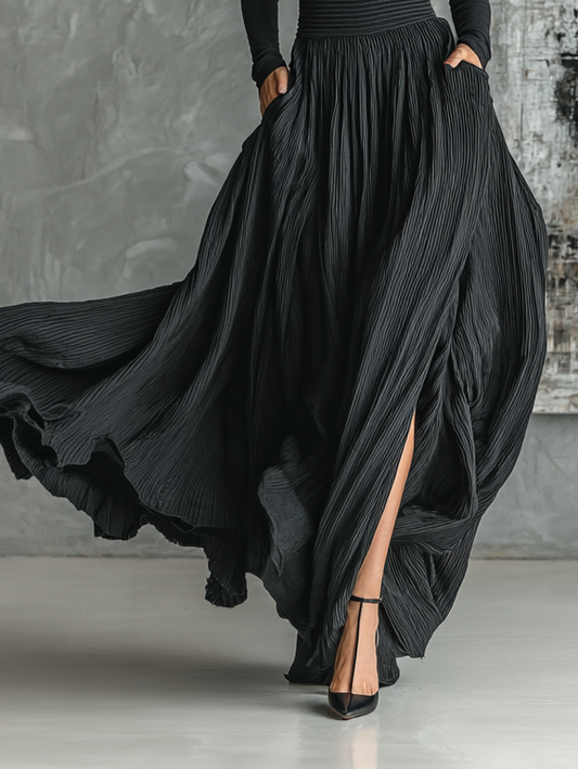 Elevate your style with the Women's Fashion All Black Skinny Turtleneck T-shirt and Pleated Skirt Set. This chic ensemble combines a sleek turtleneck with a stylish pleated skirt, perfect for creating a sophisticated yet trendy look.