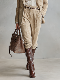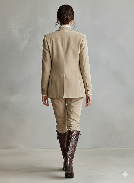 A stylish faux suede set featuring a loose blazer and matching straight-leg trousers for a chic and sophisticated look.