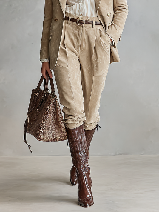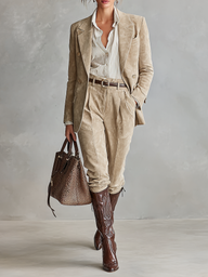 Women's Faux Suede Loose Blazer And Straight-Leg Trousers Set