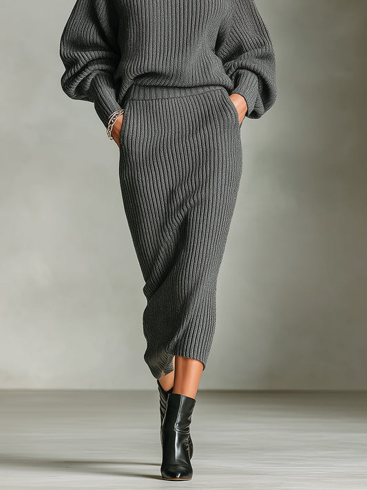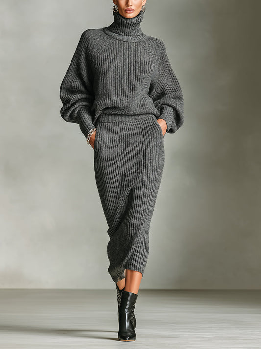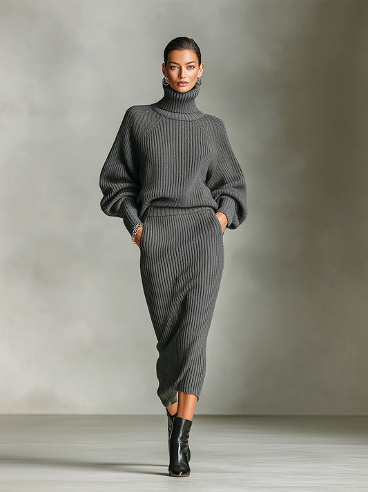 Women's Grey Elegant Ribbed Knit Turtleneck Balloon-Sleeve Midi Sweater Set