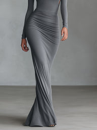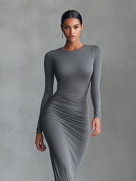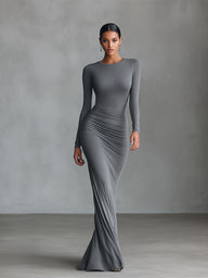 A grey stretch-Polyester-Cotton Blend maxi dress with ruched detailing and an open-back. It creates a sleek, figure-hugging look for formal events.