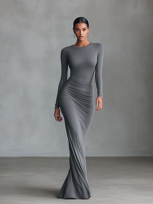 Women’s Grey Elegant Stretch-Knit Ruched Open-Back Maxi Dress