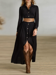 Women's Imitation Cotton And Linen Pleated Lapel Single-Breasted Long-Sleeved Maxi Dress