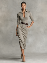 This stylish midi dress features a cozy knitted fabric with a fitted, skinny silhouette, complemented by a classic polo neck and long sleeves for a sleek, elegant look.