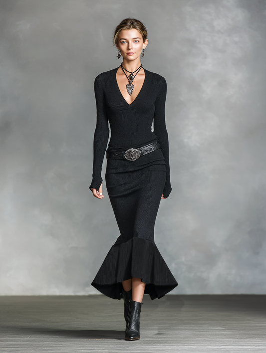 This chic maxi dress features a flattering V-neckline and slim-fit design, expertly crafted from soft knitted fabric. With long sleeves for added warmth and elegance, this dress is perfect for any occasion. Please note, the belt is not included.