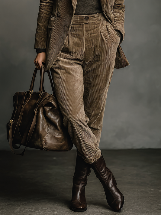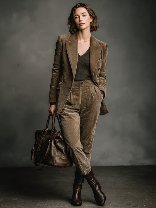 Women's Loose Corduroy Peak Collar Suit Jacket Straight Pants Set
