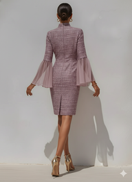 A mauve tweed sheath dress with a mock neck and organza bell sleeves. It’s chic, feminine, and perfect for dressy occasions or stylish daywear.