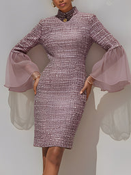 Women’s Mauve Elegant Tweed Mock-Neck Organza Bell-Sleeve Sheath Dress