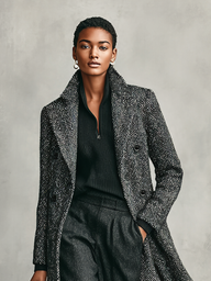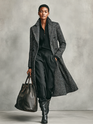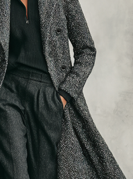 A refined long coat crafted from a premium herringbone wool blend, featuring a minimalist design with a double-breasted front and a classic lapel collar. This coat combines timeless elegance and warmth for effortless winter style.