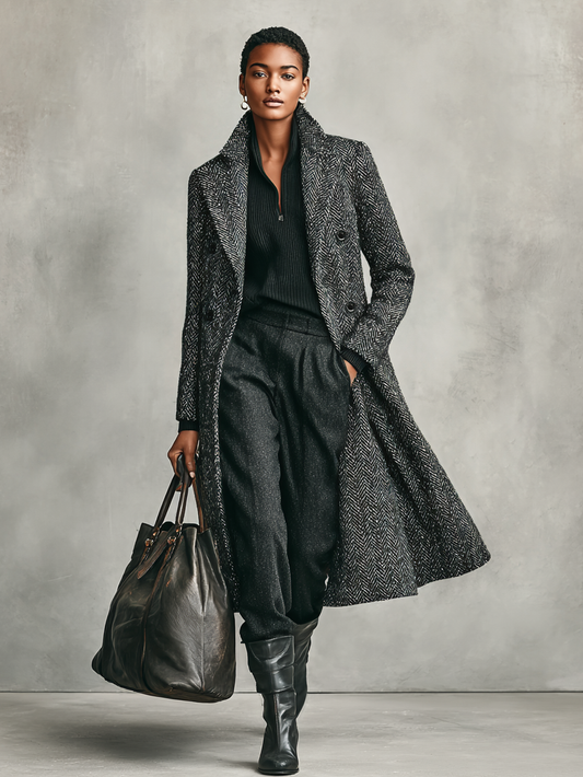 Women's Minimalist Herringbone Wool Blend Double-Breasted Long Coat