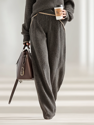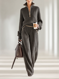 A modern two-piece set featuring a loose-fit knit sweater with a zipper half turtleneck and matching wide-leg pants. This minimalist ensemble offers comfort and style for relaxed, everyday wear.