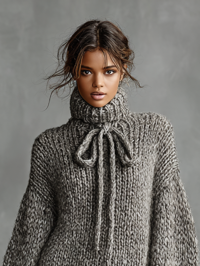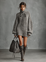 A cozy and stylish mini dress crafted from soft knit fabric, featuring a minimalist design with a high neck and charming bow tie detail. The loose fit ensures all-day comfort and effortless chic for any occasion.