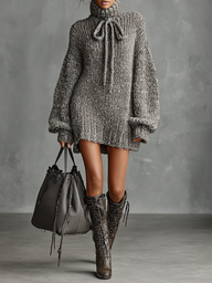 Women's Minimalist Loose Knitted High Neck Bow Tie Mini Dress