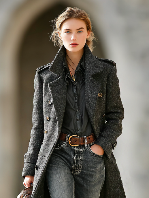 Women's Minimalist Woolen Blend Double-Breasted Lapel Epaulette Long C