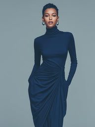 A navy jersey midi dress with a high-neck turtleneck and glamorous draped detailing along one side. It’s sleek, flattering, and ideal for chic, modern events or evenings out.