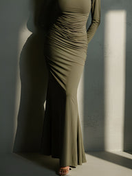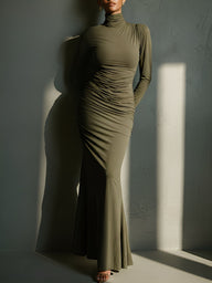 Women’s Olive Elegant Stretch Polyester-Cotton Blend Turtleneck Ruched Mermaid Maxi Dress