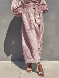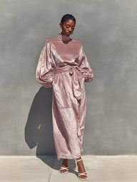 A pink velvet maxi dress with lantern sleeves and a belted waist. It’s luxurious, feminine, and ideal for formal events or upscale evenings.