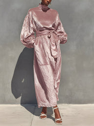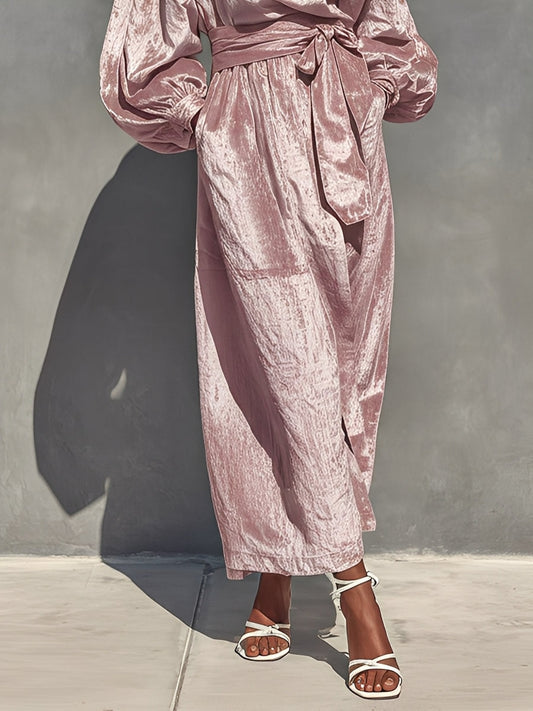 Women’s Pink Elegant Velvet Lantern-Sleeve Belted Maxi Dress