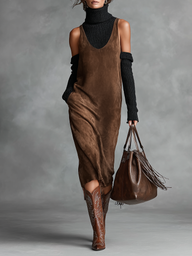 Women's Retro Simple Suede U-Neck Sleeveless Tank Midi Dress