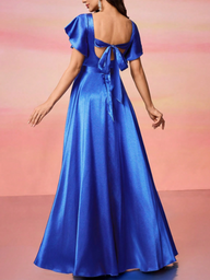 The Women's Satin Square Neck Short Sleeve Open Back Slit Hem Maxi Dress is a stunning fusion of classic design and modern detail. From its sculpted neckline and glossy satin fabric to the daring open back and flowing slit skirt, this dress is made for unforgettable entrances and refined confidence.
