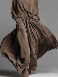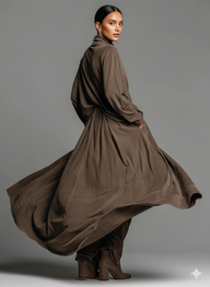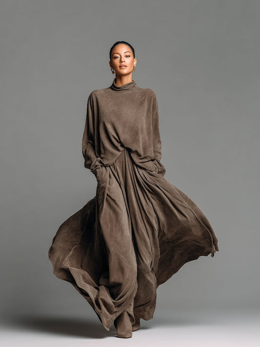 A taupe suede-like draped set with a turtleneck. It’s chic, fluid, and perfect for upscale events or stylish everyday wear.