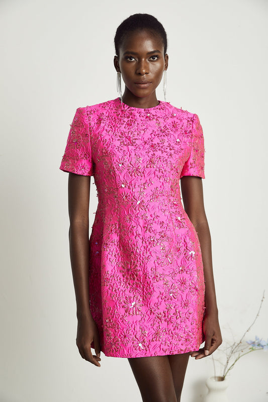 Celestia Floral-Appliqué Embellished Mini Dress in Pink