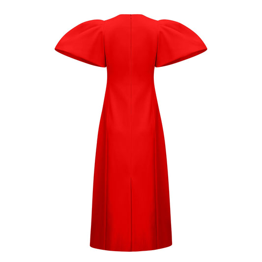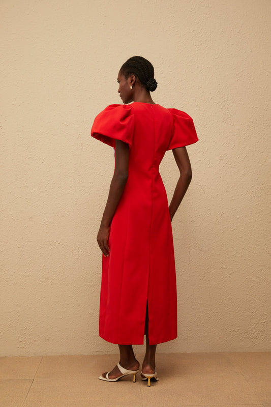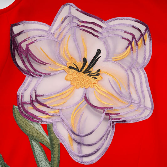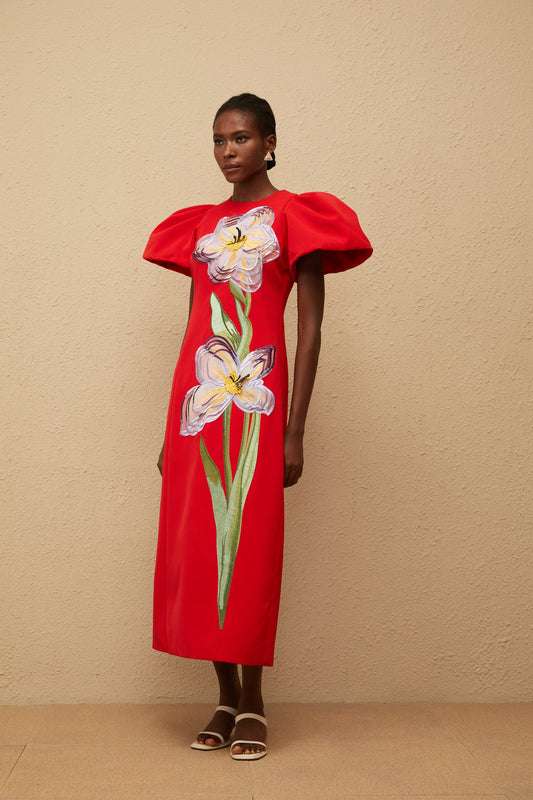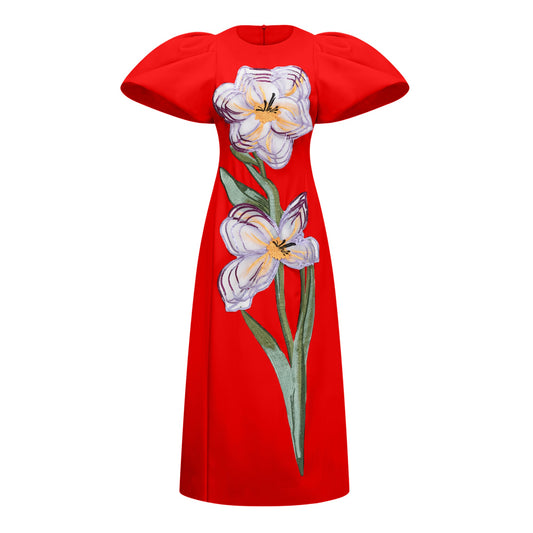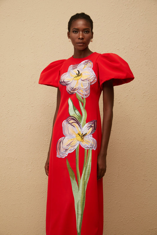 Irène Red Sequined Floral Embroidered Midi Dress