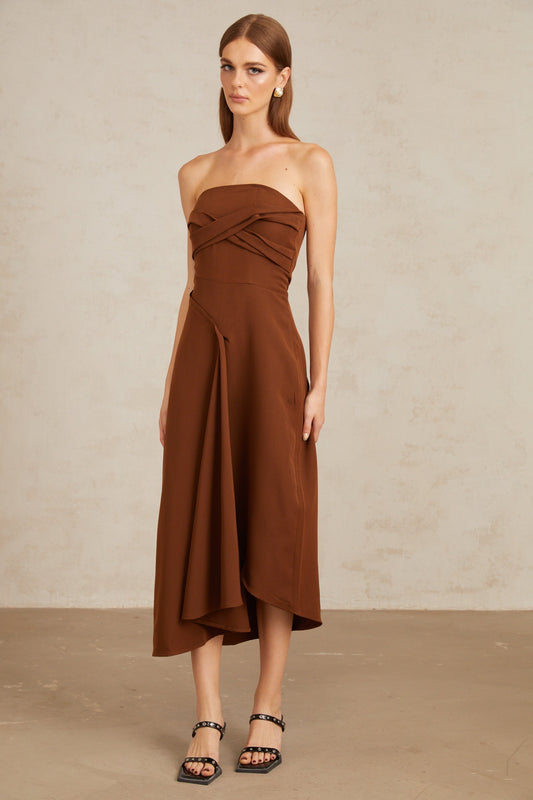 Kyliegh Brown Asymmetrical Off-Shoulder Midi Dress