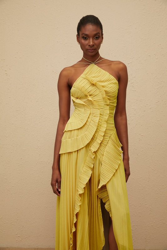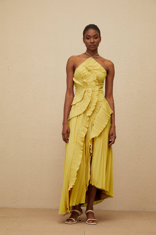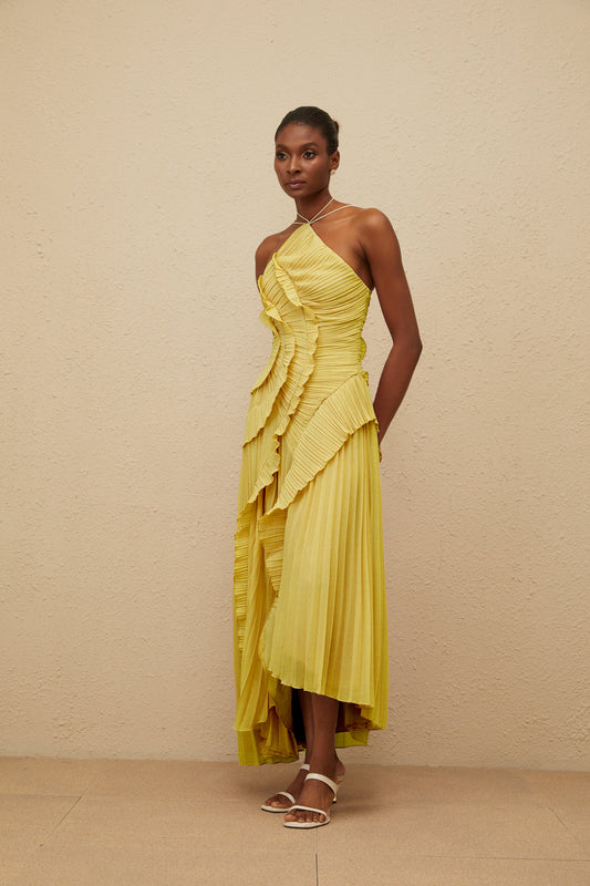 Doux Yellow Ruffled Trim Pleated Midi Dress