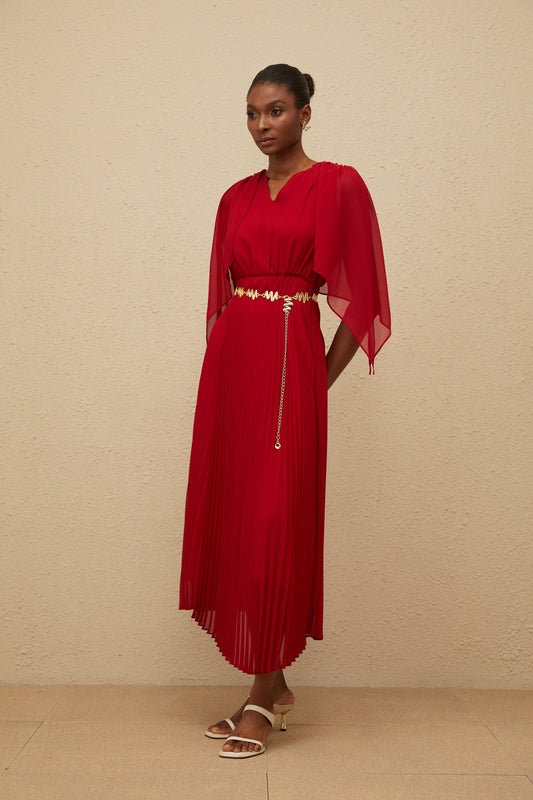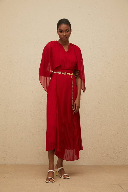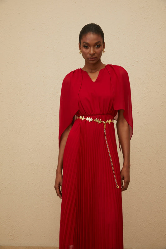 Émilie Red Pleated Maxi Dress with Cape Detail